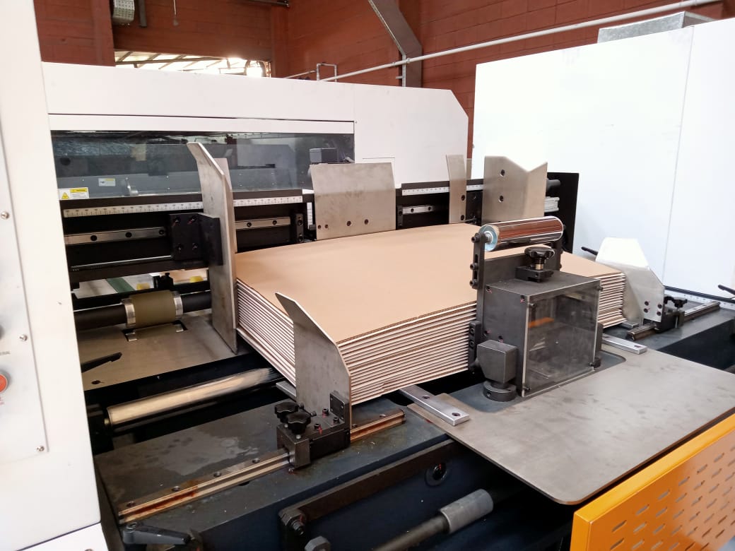 Die Cutter RMHK-1500EFC - Features: Suitable paper 1-8 mm corrugated paper (including laminated), Step-less speed control, Non-stop delivery with rolling curtain, Heavy duty gripper bars, Heavy Duty, Digital LED control panel, Die cutting chase pneumatic locking mechanism, Central Lubrication, CE Standard Machine, Automatic pressure adjustment, Air clutch.